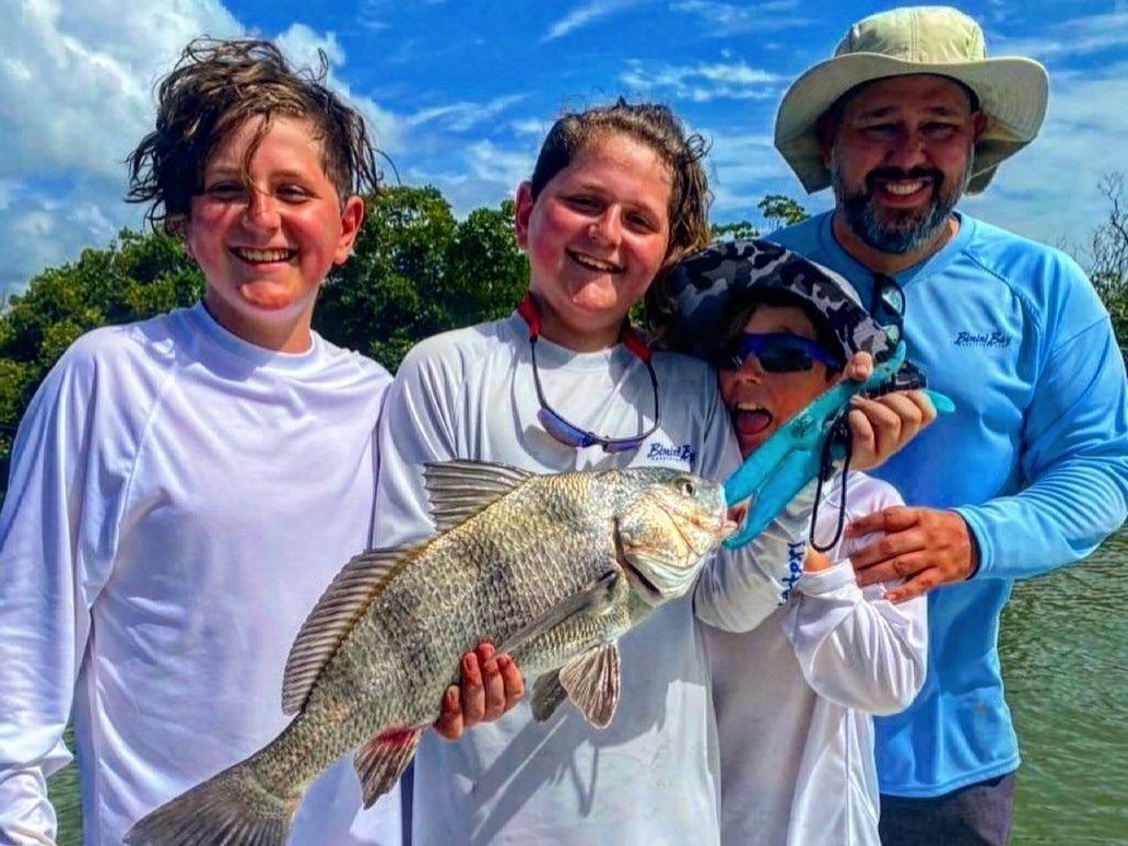 Black Drum are the gentle giants of the grass flats, and when a kid hooks into a nice drum, they're in for a surprise. These fish are powerful, steady fighters that don't jump around or make crazy runs - they just put their heads down and pull. It's the perfect introduction to fighting a legitimate fish, and drums in the 2-5 pound range are common in our area. They're bottom feeders with excellent noses for fresh shrimp, and they're found year-round in the shallow waters we fish. The kids love the way drums thump and pull, and they're great eating if you want to keep a few for dinner.